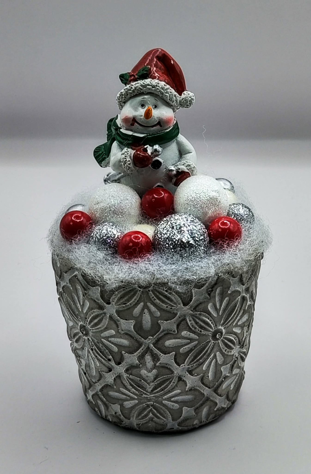 Hóember - ezüst-fehér-piros gömbökkel - karácsonyi asztaldísz - kis kőkaspóban - 2.