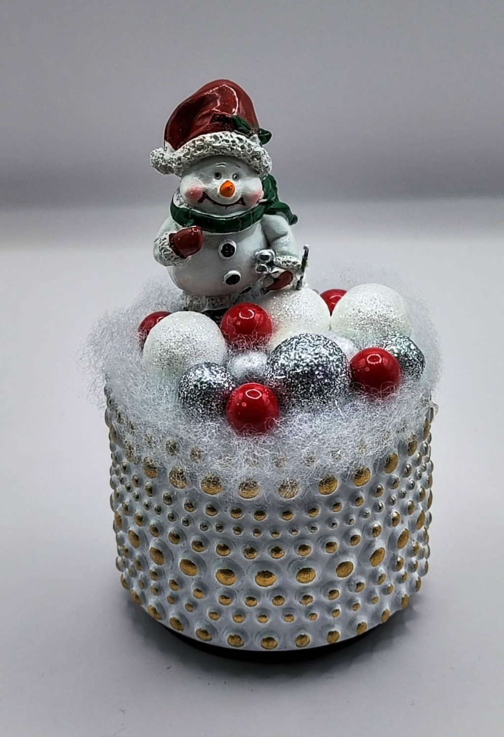 Hóember - ezüst-fehér-piros gömbökkel - karácsonyi asztaldísz - kis fehér kaspóban - arany pöttyös - 1.
