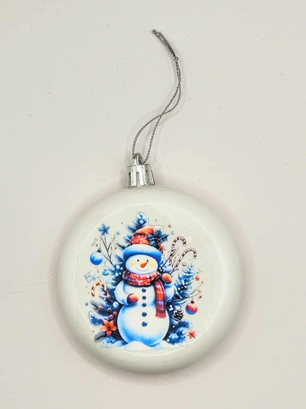 Karácsonyfa dísz - Fehér lapos kör karácsonyfadísz - Hóember mintával - celofán csomagolásban - 1.