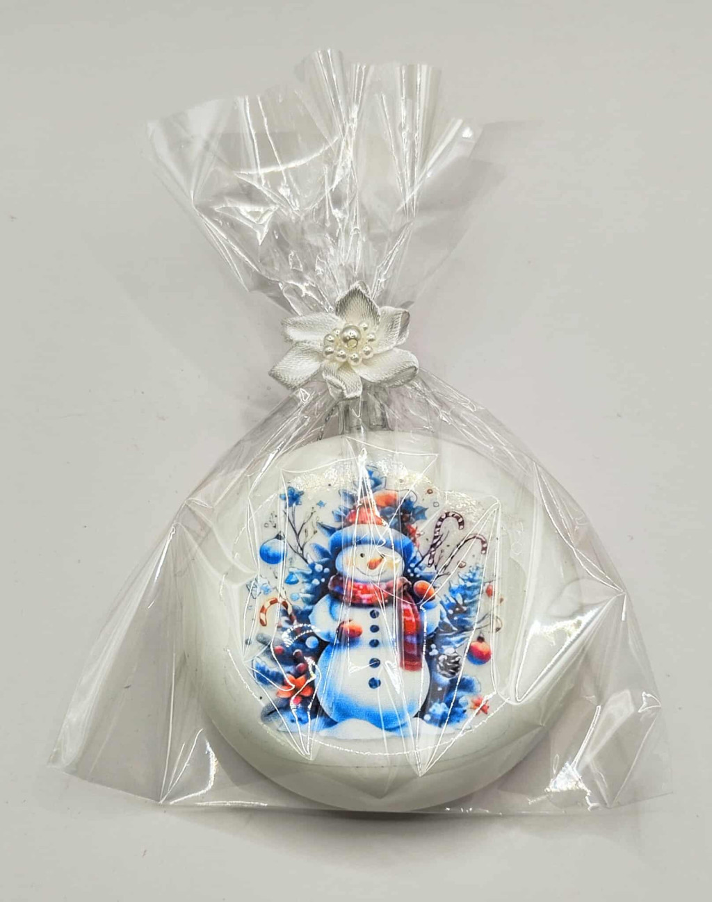 Karácsonyfa dísz - Fehér lapos kör karácsonyfadísz - Hóember mintával - celofán csomagolásban
