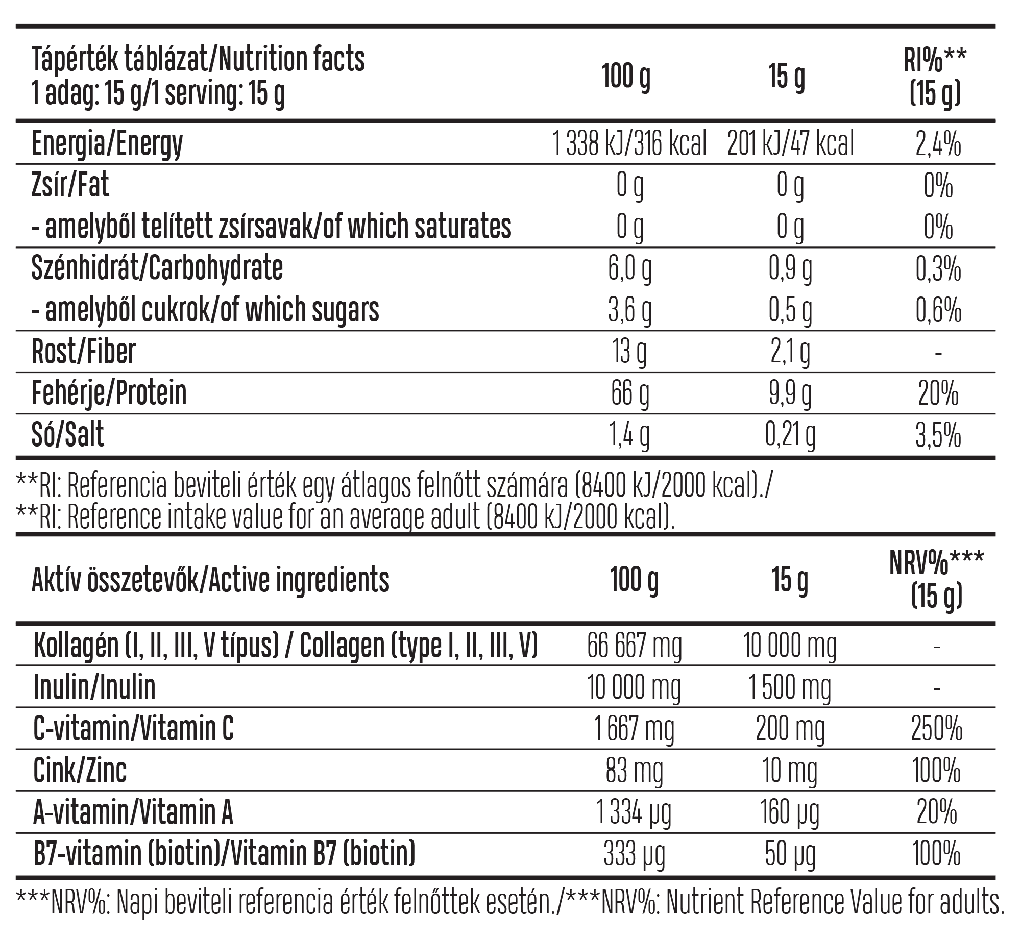 Hidrolizált marhakollagén, inulin (cikória gyökérrost), liofilizált eperdarabok, étkezési sav (citromsav), aroma, hidrolizált tengeri halkollagén, L-aszkorbinsav, édesítőszerek (aceszulfám K, szukralóz), színezék (céklavörös), étkezési só, cink-biszglicinát, retinil-acetát, D-biotin.