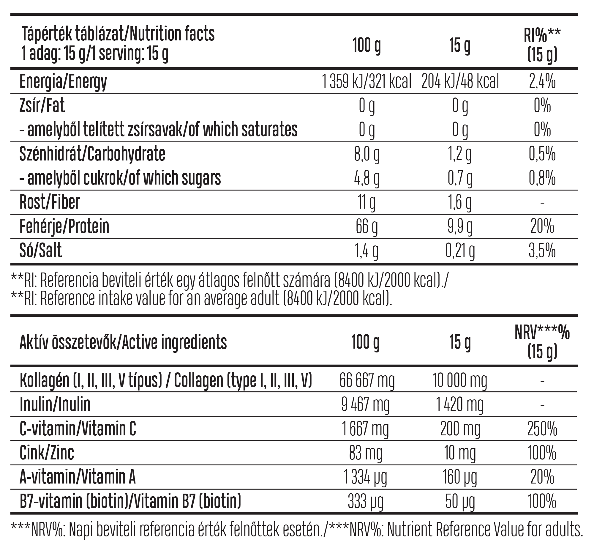 Hidrolizált marhakollagén, inulin (cikória gyökérrost), liofilizált eperdarabok, étkezési sav (citromsav), aroma, hidrolizált tengeri halkollagén, L-aszkorbinsav, édesítőszerek (aceszulfám K, szukralóz), színezék (céklavörös), étkezési só, cink-biszglicinát, retinil-acetát, D-biotin.
