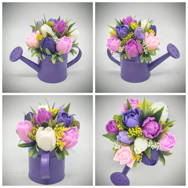 Szappanvirág csokor - Lila-rózsaszín vegyes színű tulipán szappanvirágcsokor - sötétlila locsolókannában - 2.