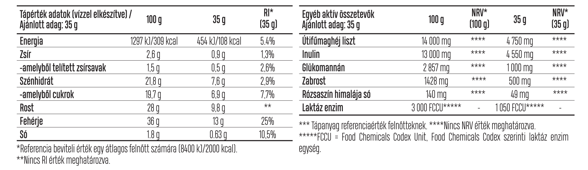 sovány tejpor, instant tejsavófehérje-koncentrátum (tejből, emulgeálószer: napraforgólecitin), 14% útifűmaghéj (Plantago Ovata) liszt, inulin, glükomannán (Amorphophallus konjac gumós gyökérből) (kén-dioxid), aromák, sűrítőanyag (xantán gumi), zabrost, só, édesítőszerek (aceszulfám K, szukralóz), rózsaszín himalájasó, laktáz enzim készítmény (maltodextrin [kukorica], laktáz enzim [β-galaktózidáz], nátrium-klorid).