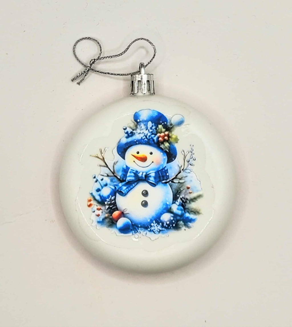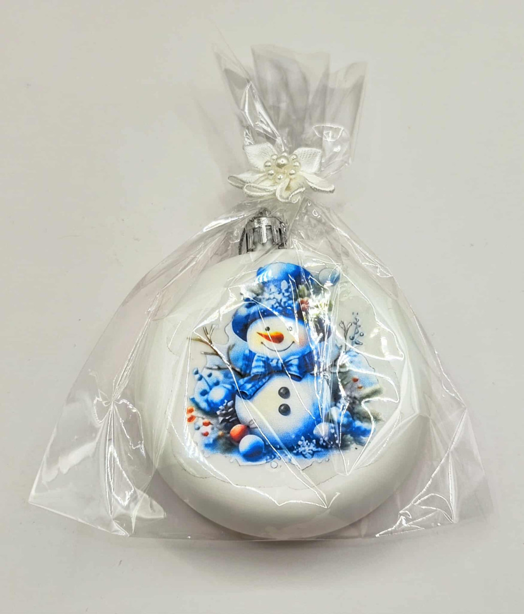 Karácsonyfa dísz - Fehér lapos kör karácsonyfadísz - Hóember mintával - celofán csomagolásban - 2.