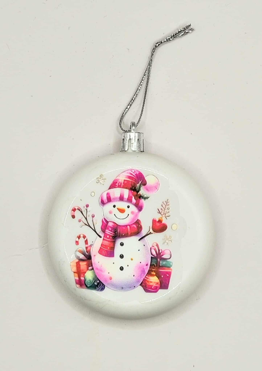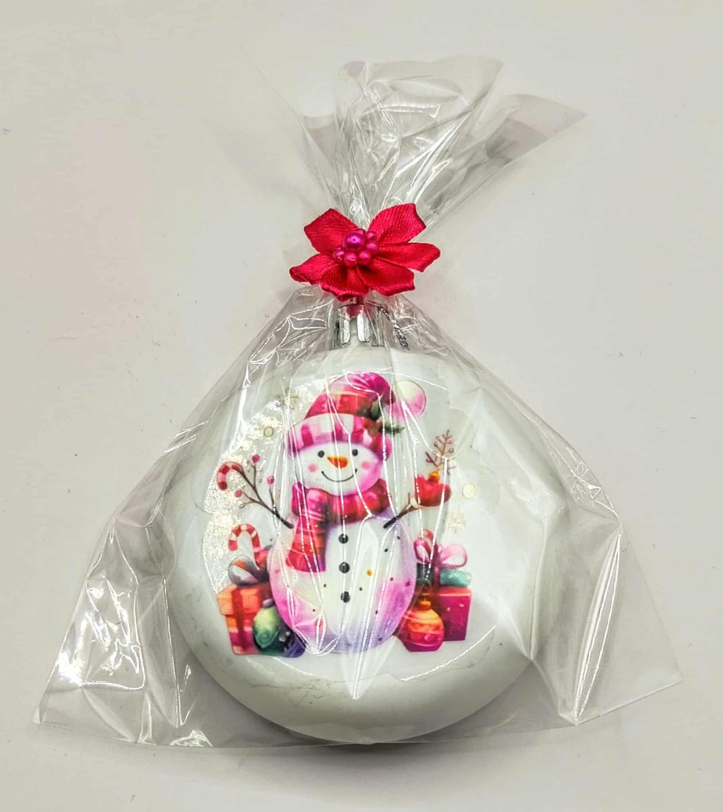 Karácsonyfa dísz - Fehér lapos kör karácsonyfadísz - Hóember mintával - celofán csomagolásban - 4.