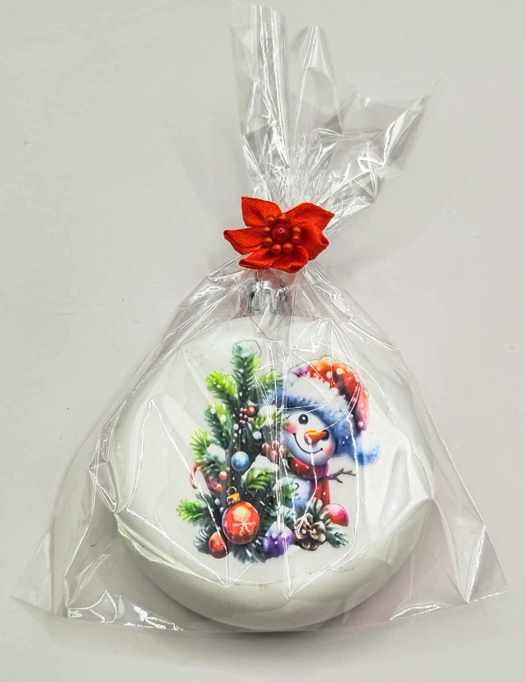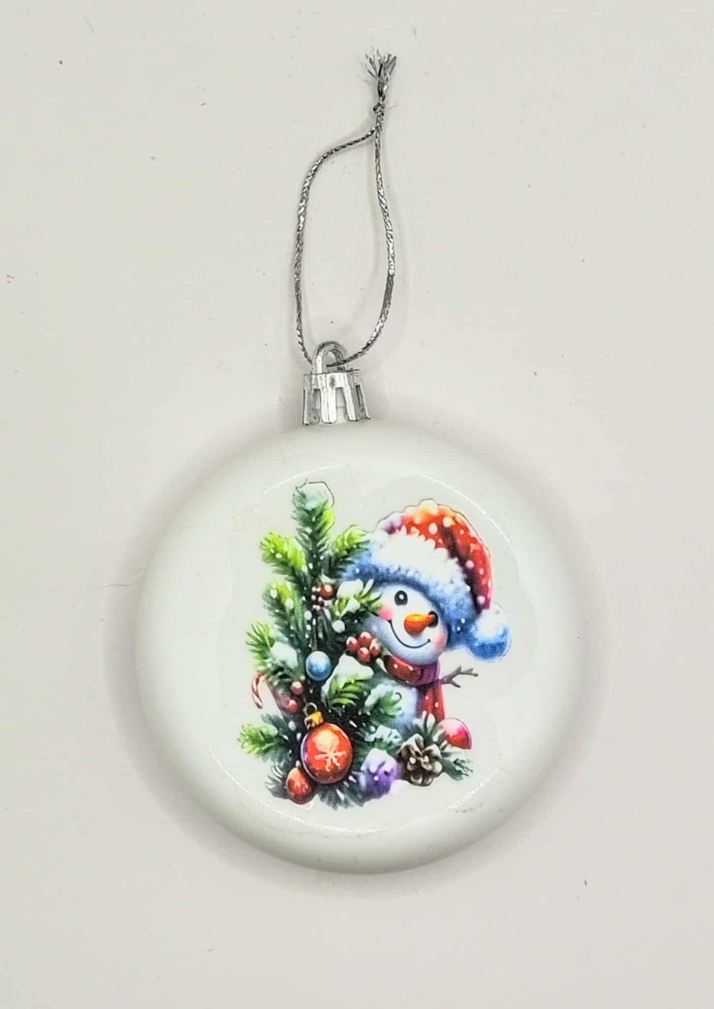 Karácsonyfa dísz - Fehér lapos kör karácsonyfadísz - Hóember mintával - celofán csomagolásban - 7.