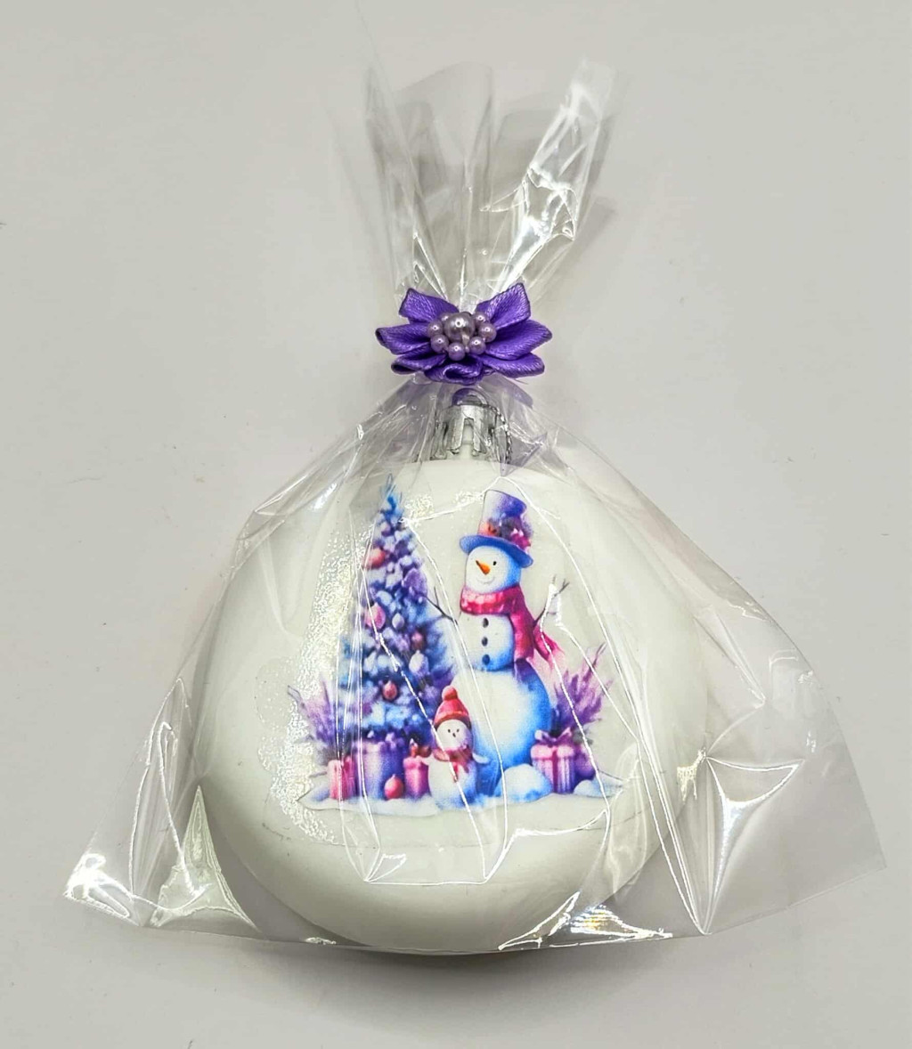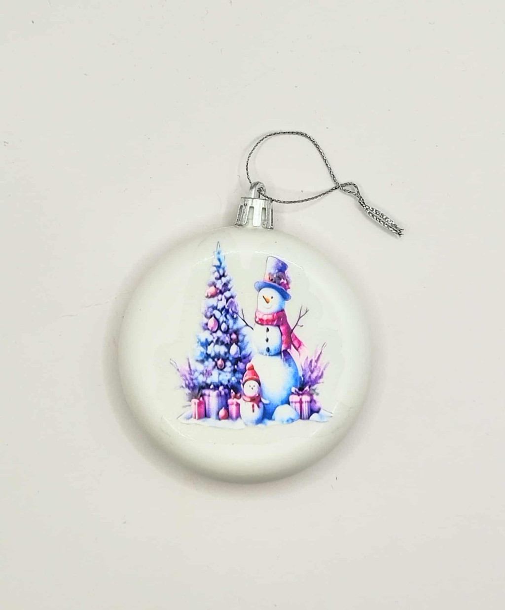 Karácsonyfa dísz - Fehér lapos kör karácsonyfadísz - Hóember mintával - celofán csomagolásban