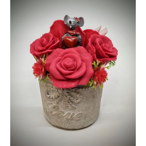 Szappanvirág csokor - egérkés - piros rózsás - beton kaspóban - 2.