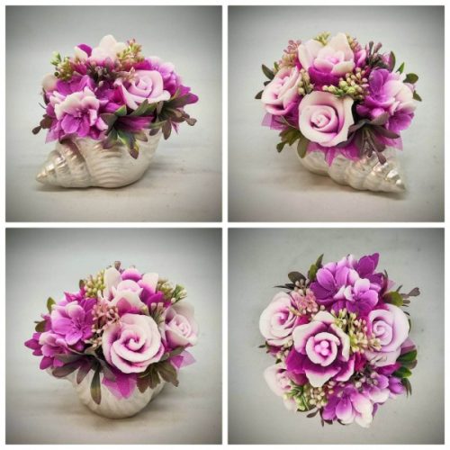 Szappanvirág csokor - Fukszia szappanvirág csokor - kis gipsz kagyló kaspóban - 2.