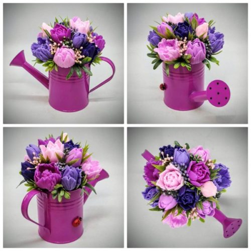 Szappanvirág csokor - Lila-rózsaszín tulipán szappanvirágcsokor - fukszia locsolókannában