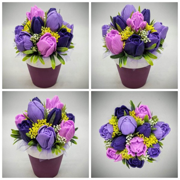 Szappanvirág csokor - Lila-rózsaszín vegyes színű tulipán szappanvirágcsokor - kis fukszia kaspóban - 4.