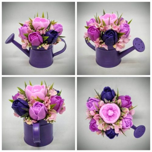 Szappanvirág csokor - Lila-rózsaszín vegyes színű tulipán szappanvirágcsokor - sötétlila locsolókannában - 1.