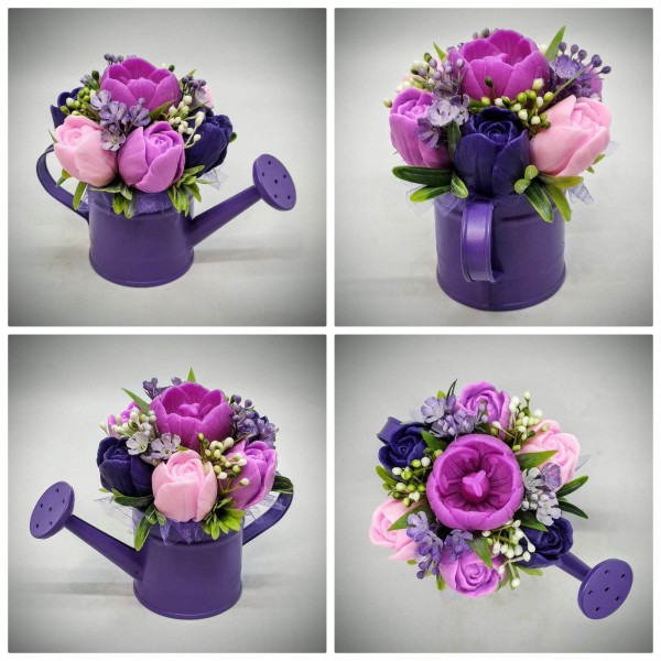Szappanvirág csokor - Lila-rózsaszín vegyes színű tulipán szappanvirágcsokor - sötétlila locsolókannában - 2.