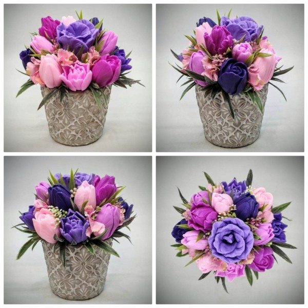 Szappanvirág csokor - Lila-rózsaszín vegyes színű tulipán szappanvirágcsokor - kőkaspóban - 8.