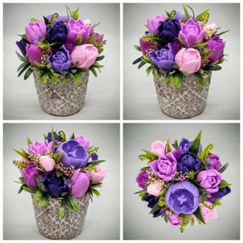 Szappanvirág csokor - Lila-rózsaszín vegyes színű tulipán szappanvirágcsokor - kőkaspóban - 9.
