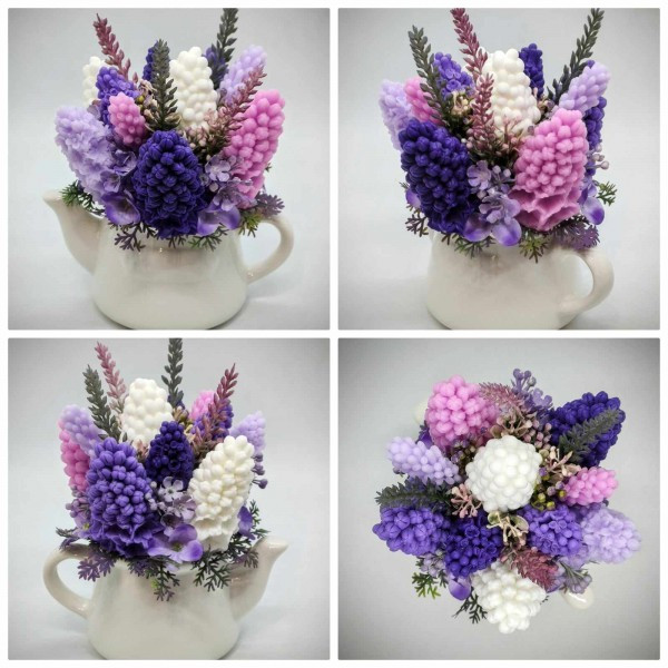 Szappanvirág csokor - Lila vegyes orgona szappanvirág csokor - fehér kerámia locsolókannában - 2.