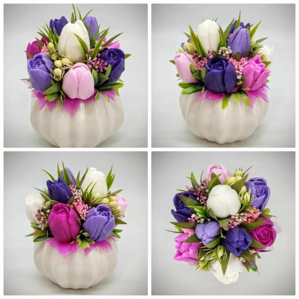 Szappanvirág csokor - Lila vegyes tulipán szappanvirág csokor - fehér kaspóban - 6.