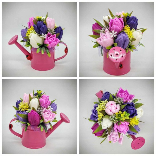 Szappanvirág csokor - Lila vegyes tulipán szappanvirág csokor - kis rózsaszín locsolókannában - 3.