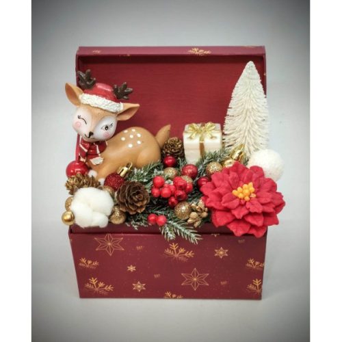 Szappanvirág csokor - Őzikés szappanvirág - piros karácsonyi ládában