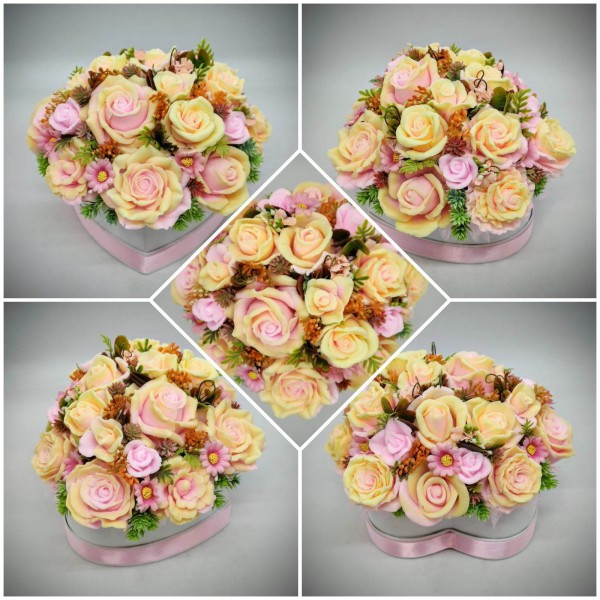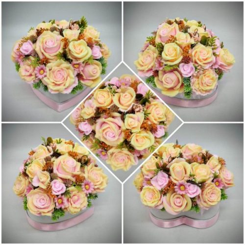 Szappanvirág csokor - sárga-rózsaszín rózsa szappanvirág csokor - fehér szív dobozban