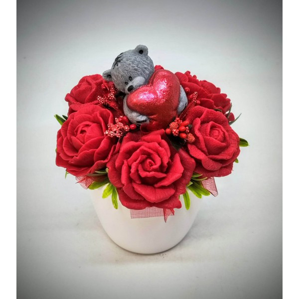 Szappanvirág csokor - szives szappan maci - piros rózsás - fehér kaspóba - 4.