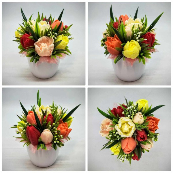 Szappanvirág csokor - Vegyes tulipán szappanvirág csokor - kis fehér kaspóban - 3.
