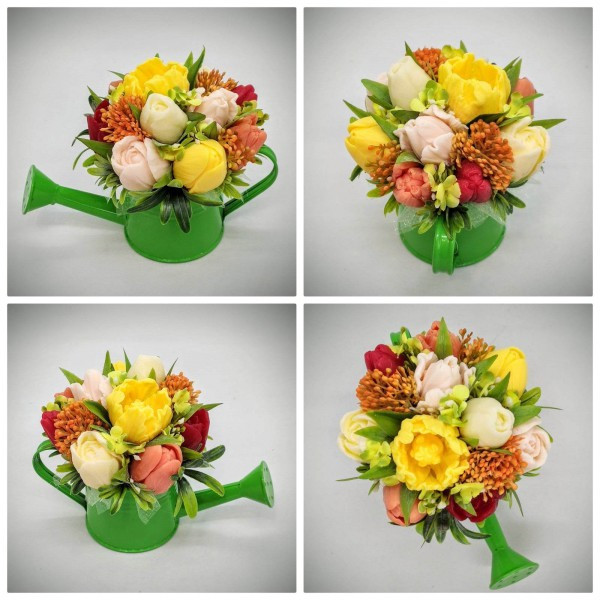 Szappanvirág csokor - Piros-sárga-narancs vegyes tulipán szappanvirág csokor - zöld kis locsolókannában - 9.