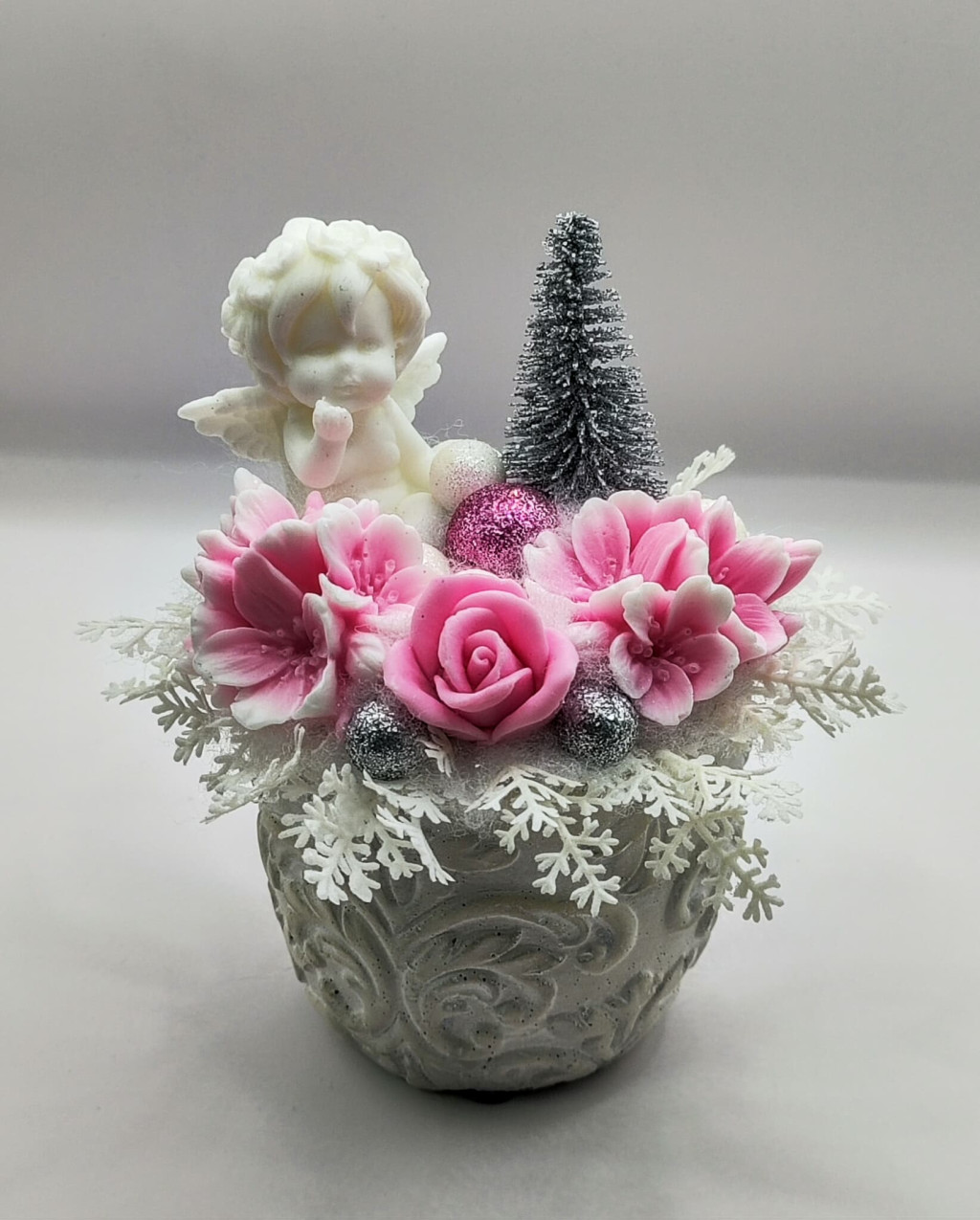 Szappanvirág csokor - angyalka - ezüst fenyővel - fehér mintás kaspóban Kézzel készített, illatos szappan csokrok, asztali díszek, egyedi szappanok készítése.