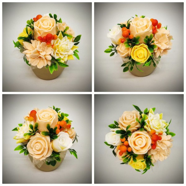 A szappant, amiből a virágok készülnek, egyedileg színezem, illatosítom és öntöm formába, majd ezekből az elkészült szépségekből állítom össze a csokrokat, boxokat.Választható szinekben, több különböző illattal rendelhető.
