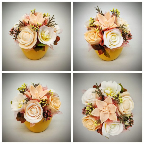 Szappanvirág csokor - barack csokor - sárga kis kaspóban -2. Kézzel készített, illatos szappan csokrok, asztali díszek, egyedi szappanok és fürdősók