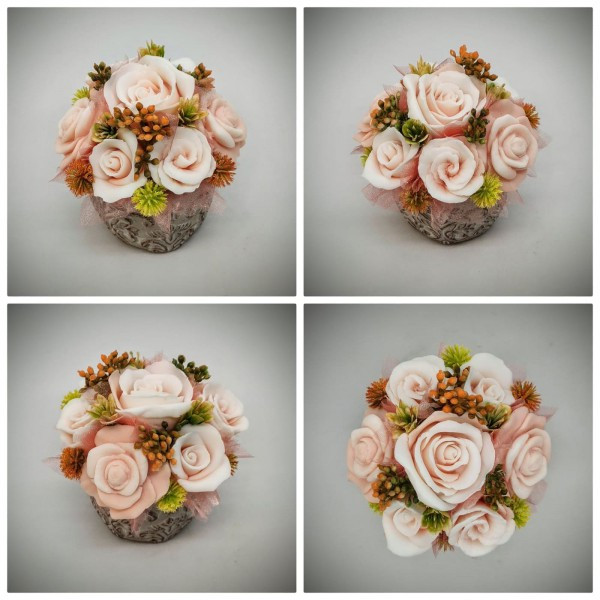 Szappanvirág csokor - barack - fehér - szappanvirág csokor - kis kőkaspóban - 2. Kézzel készített, illatos szappan csokrok, asztali díszek, egyedi szappanok készítése.