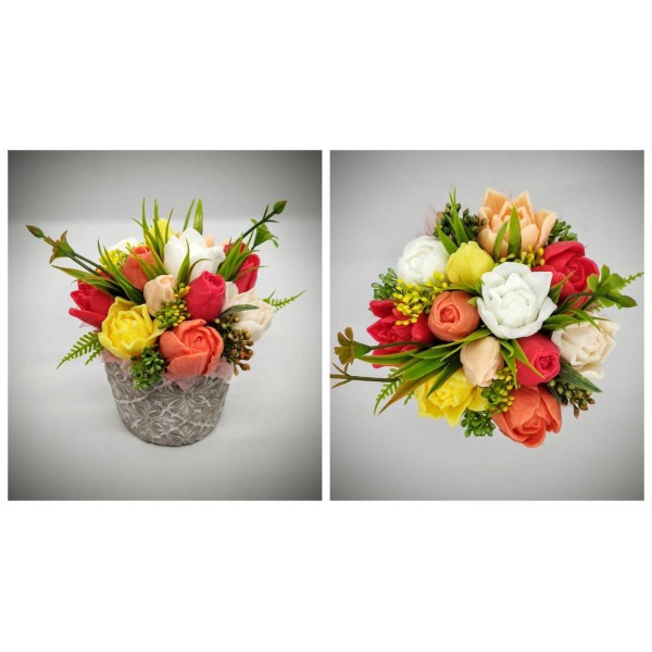 Szappanvirág csokor - barack-sárga-piros vegyes tulipán csokor - kőkaspóban - 6. Kézzel készített, illatos szappan csokrok, asztali díszek, egyedi szappanok és fürdősók