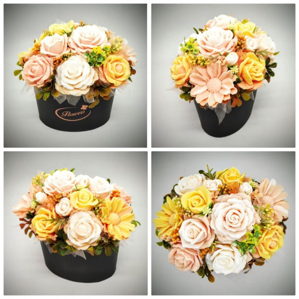 Szappanvirág csokor - barack szappanvirág csokor - fekete ovális dobozban Kézzel készített, illatos szappan csokrok, asztali díszek, egyedi szappanok készítése.