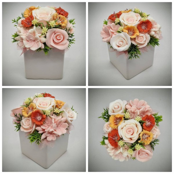 Szappanvirág csokor - barack - szappanvirág csokor - kis fehér kocka kaspóban - 3. Kézzel készített, illatos szappan csokrok, asztali díszek, egyedi szappanok készítése.