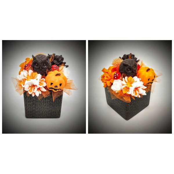 Szappanvirág csokor - barna bagollyal 1 - halloween csokor - fekete kocka kaspóban Kézzel készített, illatos szappan csokrok, asztali díszek, egyedi szappanok készítése.