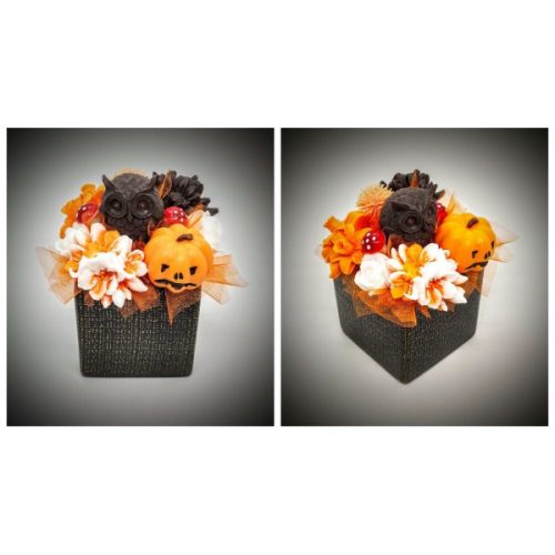 Szappanvirág csokor - barna bagollyal 1 - halloween csokor - fekete kocka kaspóban