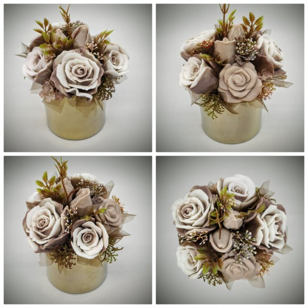 Szappanvirág csokor - Barna szappanvirág csokor - arany kör kaspóban Kézzel készített, illatos szappan csokrok, asztali díszek, egyedi szappanok készítése.