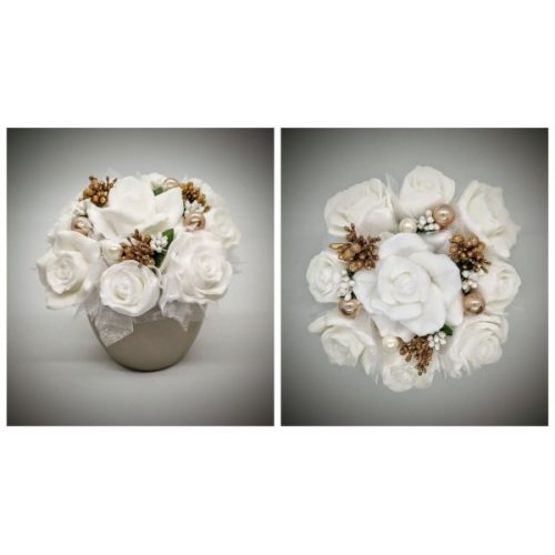 Szappanvirág csokor - fehér - arany dísszel - pezsgő színű kaspóban