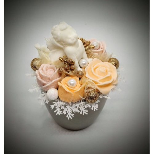 Szappanvirág csokor - fekvő angyal - barack rózsákkal - pezsgő színű kaspóban Kézzel készített, illatos szappan csokrok, asztali díszek, egyedi szappanok és fürdősók