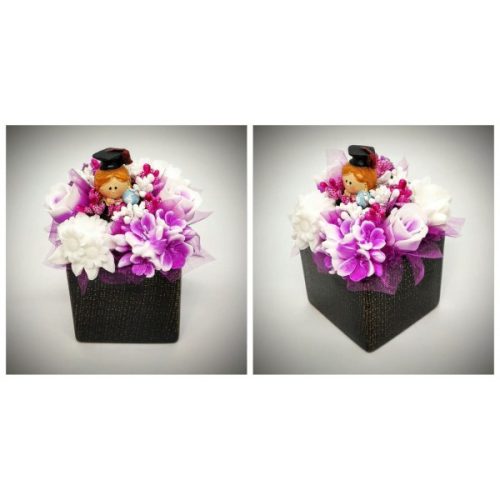 Szappanvirág csokor - Fukszia - fehér ballagó kislány szappanvirág csokor - fekete kocka kaspóban