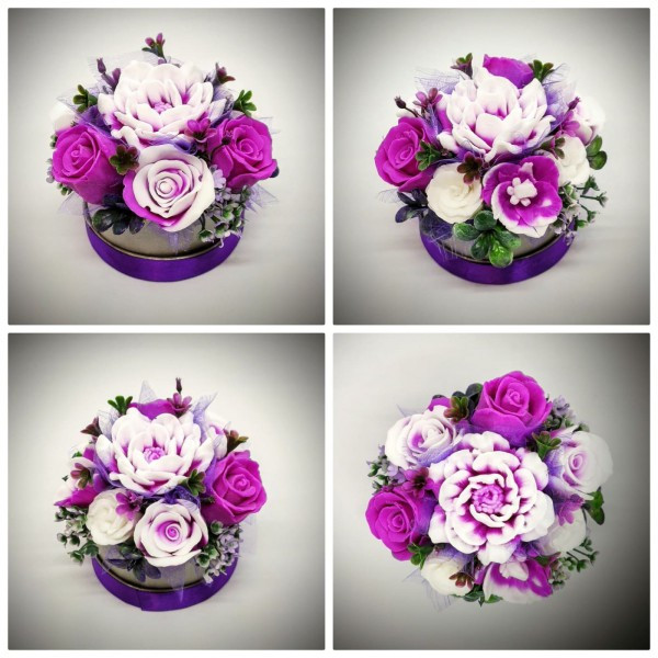 Szappanvirág csokor - fukszia-fehér csokor - ezüst kör dobozban lila szalaggal -2. Kézzel készített, illatos szappan csokrok, asztali díszek, egyedi szappanok készítése.
