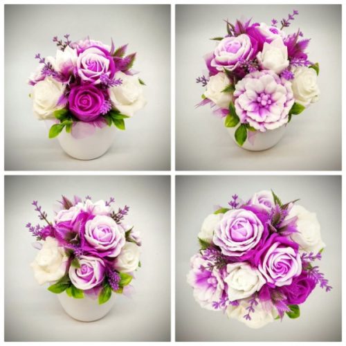 Szappanvirág csokor - Fukszia-fehér csokor - fehér kaspóban Kézzel készített, illatos szappan csokrok, asztali díszek, egyedi szappanok készítése.
