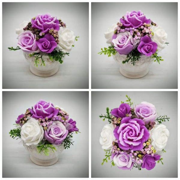 Szappanvirág csokor - fukszia - fehér - szappanvirág csokor - fehér kis kaspóban - 2F. Kézzel készített, illatos szappan csokrok, asztali díszek, egyedi szappanok készítése.