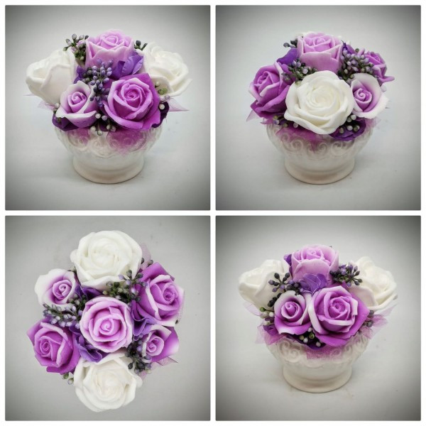 Szappanvirág csokor - fukszia - fehér - szappanvirág csokor - fehér kis kaspóban - 3F. Kézzel készített, illatos szappan csokrok, asztali díszek, egyedi szappanok készítése.