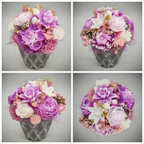 Szappanvirág csokor - fukszia-lilás-fehér szappanvirág csokor - szürke műanyag kaspóban - 2. Kézzel készített, illatos szappan csokrok, asztali díszek, egyedi szappanok készítése.