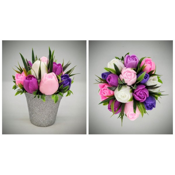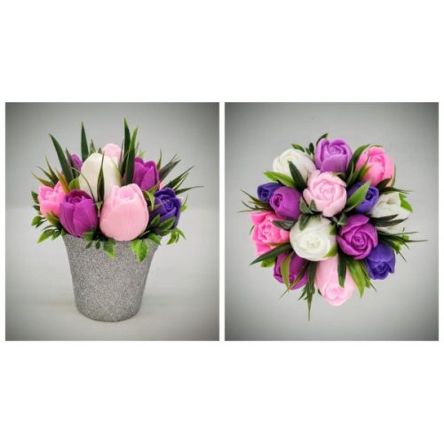Szappanvirág csokor - fukszia-rózsaszín-lila vegyes tulipán csokor - ezüst csillámos műanyag kaspóban - 1. Kézzel készített, illatos szappan csokrok, asztali díszek, egyedi szappanok és fürdősók
