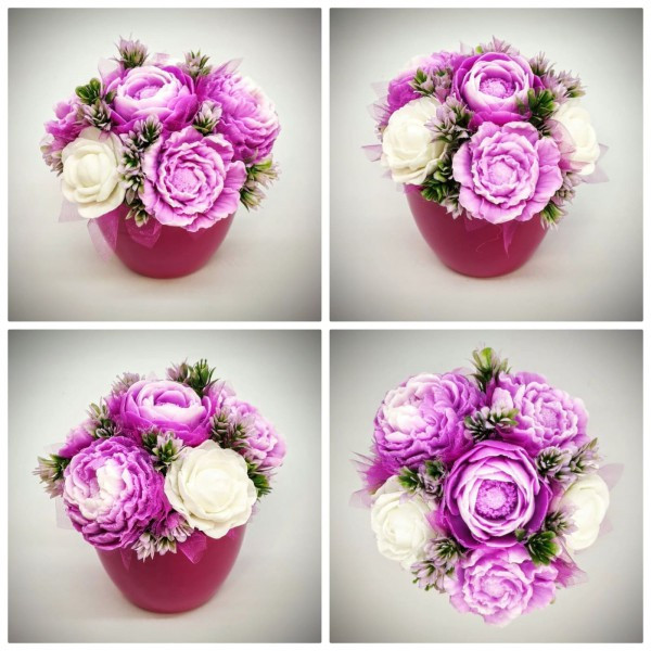 Szappanvirág csokor - fukszia szappanvirág csokor - fukszia kaspóban - 5. Kézzel készített, illatos szappan csokrok, asztali díszek, egyedi szappanok készítése.