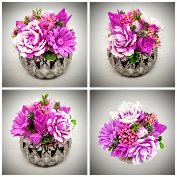Szappanvirág csokor - fukszia színű csokor - ezüst bordázott kaspóban Kézzel készített, illatos szappan csokrok, asztali díszek, egyedi szappanok készítése.