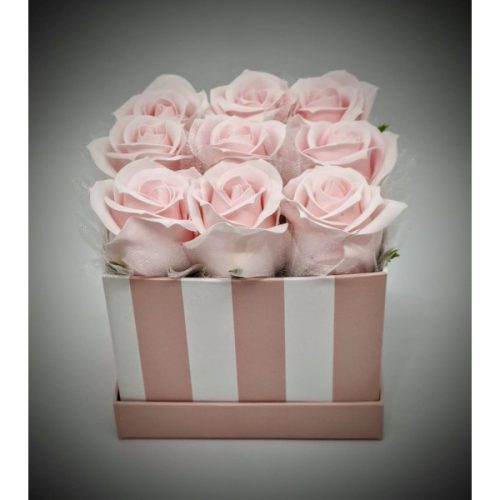Szappanvirág csokor - halvány rózsaszín szappanrózsa csokor - csíkos kocka dobozban